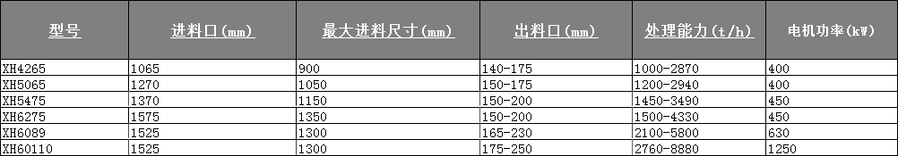 XH 旋回式破碎機擁有精細的破碎腔設計,確 保更強的生產能力、更大的進料粒度及更長的襯板 壽命;大傾角和長破碎面設計,配合優化設計的沖 程和轉速,使破碎機具有超強的破碎能力,適用于 各種粗碎破碎作業需求;通過簡單更換偏心套,就 可以改變破碎機的處理能力,以滿足不同的破碎工 藝需求。